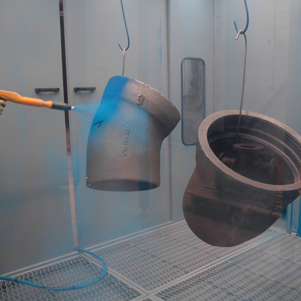 В марте 2018 г. на нашем предприятии запущен цех полимерной покраски фасонных частей из высокопрочного чугуна площадью 400 кв. м., оснащенный современным оборудованием.